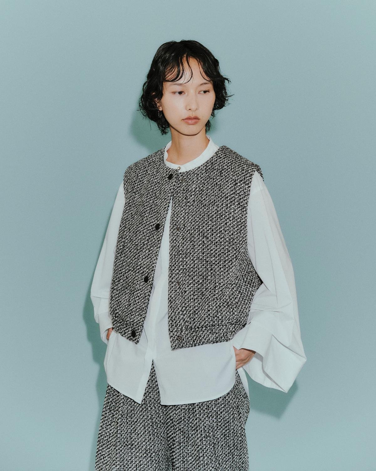 ツイードベスト¥33,000 スリーブタックブラウス¥19,800 ツイードタックフォルムパンツ¥26,400 -