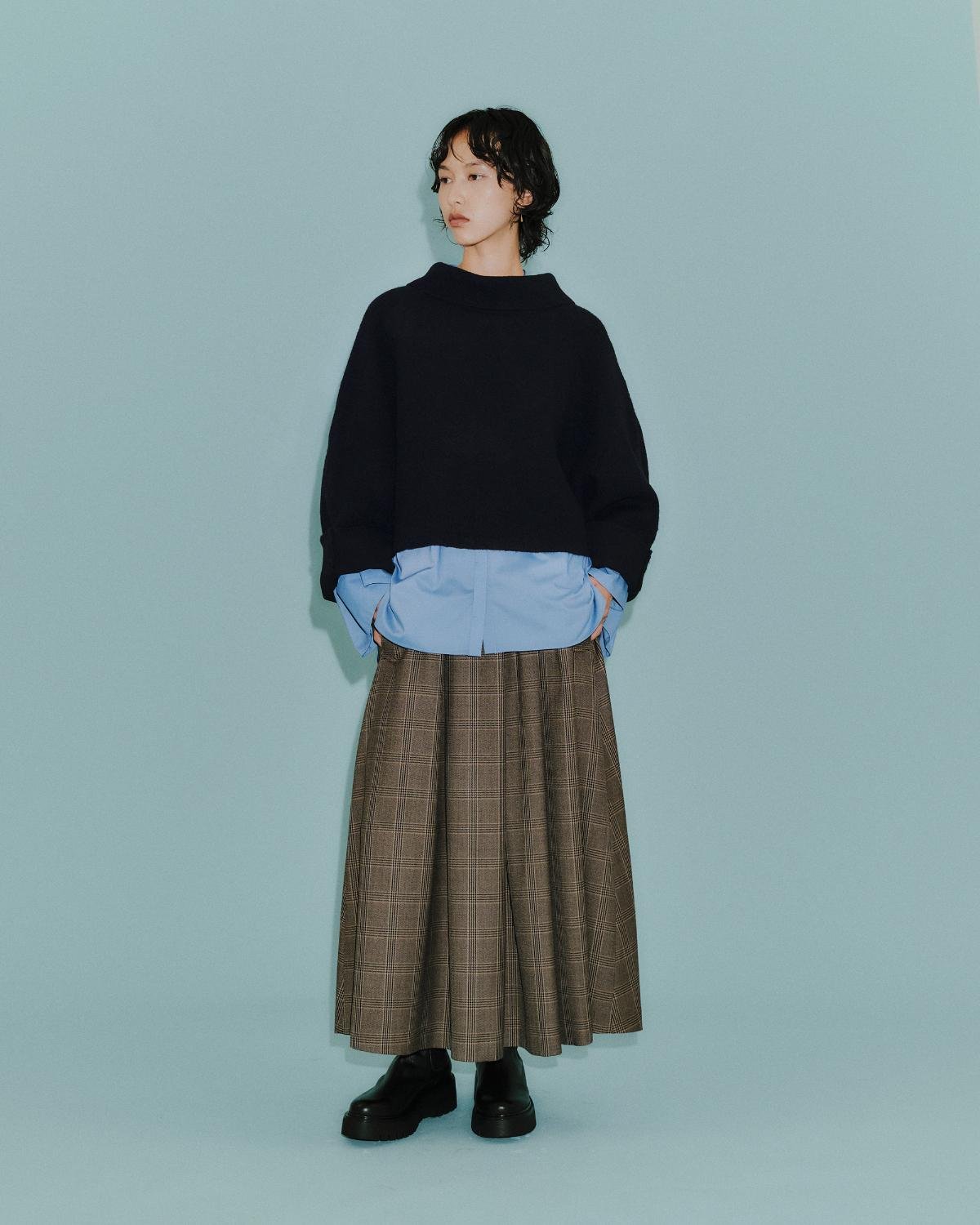 2WAYニットポンチョ¥26,400(「CAST:」11/1展開) スリーブタックブラウス¥19,800タックギャザーチェックスカート¥26,400