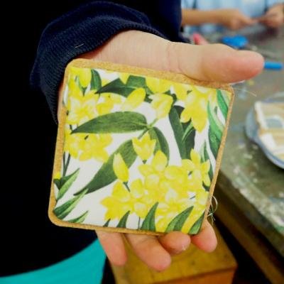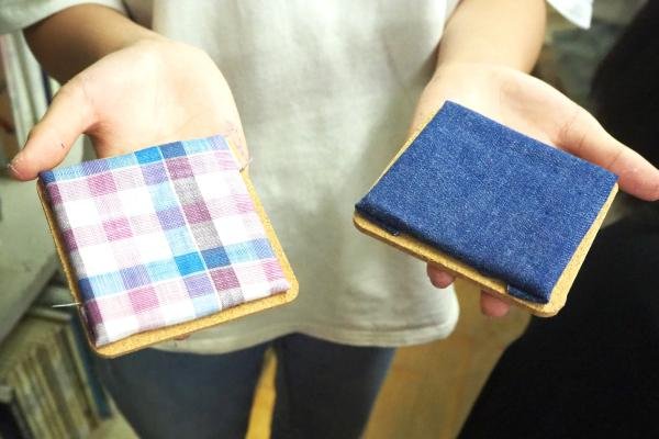 会社について、服ができるまでの流れ、アップサイクルとは?の説明を行った後、当社の残布を使ってみんなで「コースター」をつくりました。